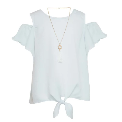 Your girl’s closet needs this Amy Byer Amy Byer Girls’ Cold Shoulder, Tie Front Top with Necklace! The shoulder detail and pretty tie front make this blouse not only comfortable, but fashionable as well. The necklace is an easy no-brainer to complete the outfit and versatile enough to wear with her other favorite pieces.Amy Byer is a tween dream … offering fashion, trend, value, and quality to the next generation of fashionistas. Our styles are designed to instill self-confidence at school, home, or on the playground. Our mission is for every young girl to feel beau-tee-ful in Amy Byer!