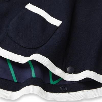 Your baby will look and feel their adorable best wearing this Adaptive Snap Blazer with Abdominal Access from Rowing Blazers x Target. Specially designed for sensory needs, this item features flat seams and no tags to eliminate abrasion against the skin. Seams are intentionally chosen to withstand high-level activity without irritating the skin. Garment care and size information is provided through heat seal labels, not itchy tags. Featuring front snap buttons for easy dressing, the blazer is made from a soft recycled polyester blend with spandex in navy and white hues.