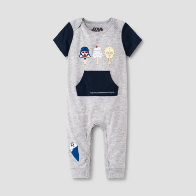 The Force will always be with your little one when you dress them in this 2-Pack Star Wars Romper Set. This outfit set includes one romper and one bodysuit, both crafted from a soft fabric blend for all-day comfy wear. These outfits feature crotch snaps for easy diaper changes, while lap shoulders make dressing a breeze. The gray romper features an illustration of Stormtrooper, C-3PO, Darth Vader and space shuttle-shaped popsicles with the message “May the snacks Be With You” written on the navy kangaroo pocket. The white bodysuit features an allover print of popsicle-style prints of different Star Wars characters. Coordinate them with other separates or accessories from their closet to create an array of fun outfit choices.