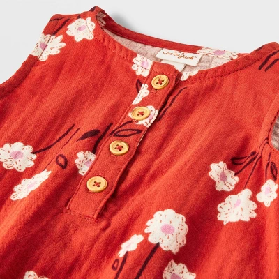 Refresh your baby’s everyday wardrobe with this Floral Gauze Tank Henley Romper from Cat & Jack™. This sleeveless gauze romper features a three-button placket henley neck and a cream floral pattern against a bright red background for sweet charm. The 100% cotton fabric along with elastic at the leg openings makes this tank romper cool and comfortable to wear, while the crotch snaps allow for easy diaper changing.