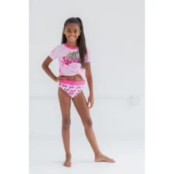 - Officially licensed Barbie little girls cool and stylish short sleeve swim shirt top and cute and stylish full coverage bottom
