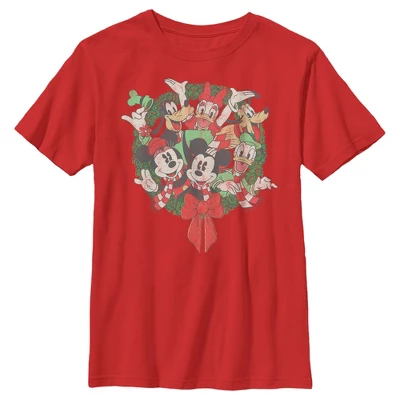 - Strut your stuff with this stylish new boys’ t-shirt that is perfect for the holiday season! Featuring a Christmas wreath with Mickey Mouse, Minnie Mouse, Donald Duck, Daisy Duck, Goofy, and Pluto across the front.