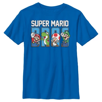 - Strut your stuff with this stylish new boys’ t-shirt that is perfect for every occasion! Featuring the text: “Super Mario Bros,” with Mario, Yoshi, Toad, and Luigi inside each letter.