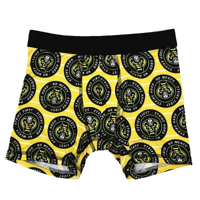 Celebrate the karate TV series in comfort with these Cobra Kai boxer briefs. The boxers come in shades of black, yellow, and red and feature images of the cobra logo while red letters on the boxers spell out the series title. Fans of the Cobra Kai show will love the designs on these boxers.