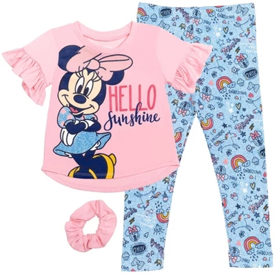- Officially licensed Disney little girls 3 piece mix n’ match clothing set: short sleeve graphic tee shirt, leggings, and elastic hair scrunchie