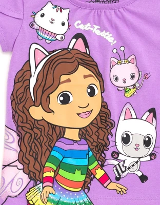 Join Gabby and her best stuffed animal pal Pandy Paws on their dollhouse adventures in this Gabby’s Dollhouse Short Sleeve T-Shirt & Skirt & Scrunchie. Make crafts, bake, garden, and learn with all the adorable Gabby Cats: Cakey, Kitty Fairy, Pillow Cat, Baby Box, DJ Catnip, MerCat, CatRat, and Carlita. Your little girl is dressed for fun and play in this 3 piece mix n’ match clothing set: short sleeve graphic tee shirt, skirt, and elastic hair scrunchie.