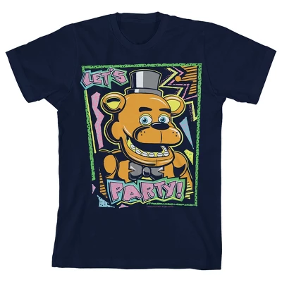 - GRAPHIC TEE: Freddy Fazbear is surrounded by bright blue, pink, and yellow shapes on this tee. Above and below Freddy, pink text reads, “Let’s Party.” This tee makes a great gift for young Freddy fans.