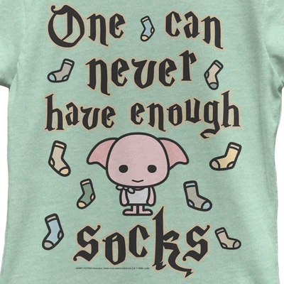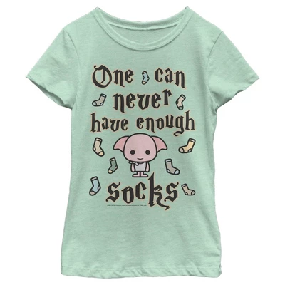 - Strut your stuff with this stylish new everyday girls’ t-shirt that is perfect for every occasion! Featuring Dobby in a cute cartoon style with the text: “One can never have enough socks,” across the front.