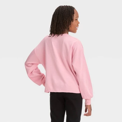 Your Barbie-loving kid will love adding this Barbie Malibu Dreamy Pullover Sweatshirt to their cool-weather wardrobe. Designed in a pretty shade of light pink, this crewneck sweatshirt sports a front varsity Barbie Malibu emblem in dark pink for a cute, dreamy look. The midweight fleece construction offers them cozy comfort, and the loose-fit cut makes it easy to layer over tops and bottoms. The look is finished with cool, laid-back vibes thanks to the dropped shoulders and raw hem.