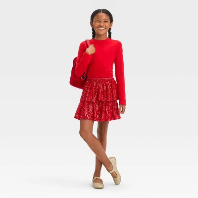 Your kid will be ready to shine during the holiday season and beyond wearing the Tiered Sequin Holiday Skirt from Cat & Jack™. This red tiered skirt is covered with sequins for extra glam. It comes with a full elastic waistband for a perfect fit, and it’s designed with an above-knee length. Made from soft and stretchy fabric with taffeta lining, this mid-rise skirt offers all-day comfort and easy pairing with a variety of their favorite tops.