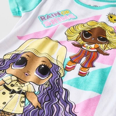 Your kiddo will love to dress up in their favorite bedtime look with this 4-Piece L.O.L. Surprise! Pajama Set. This sleepwear set includes two printed short-sleeve tees, pink pajama shorts and a pair of printed pajama pants. Made from breathable cotton material in a snug fit for comfy wear throughout the night, this four-piece pajama set features colorful illustrations of L.O.L. Surprise! dolls for a fun-themed look. The pull-on crewneck and waist allow for easy wear, and the pieces in this set can be worn together or paired with other pajamas for a variety of sleepwear options.