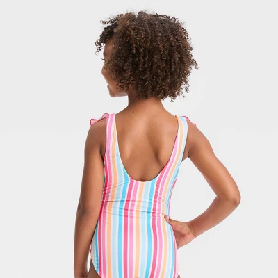 Add timeless style to your kid’s swim closet with the Striped Sunshine Bound One-Piece Swimsuit from Cat & Jack™. This one-piece swimsuit is covered with a colorful striped pattern for a fun vibe, and ruffles run from shoulders to waist for sweet charm. The soft, stretchy fabric with full lining makes the sleeveless swimsuit so comfortable to wear. Designed in a pull-on style for easy wear, the UPF 50+ rated design will help keep them shielded from the sun’s rays.
