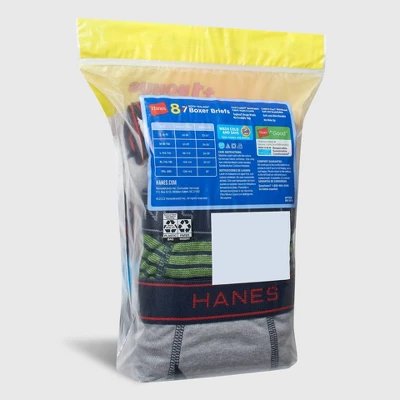 Hanes® boys’ boxer briefs are crafted from soft, ring-spun cotton for all-day comfort. A no-ride-up style, the classic boxer brief offers a stretch Comfort Flex® waistband that is soft and will move with him. Hanes® innovative Cool Comfort® fabric wicks moisture away, keeping him cool and dry even during his most active days. The smooth Tagless® boxer brief is designed to last wash after wash. Stock up with this limited-time bonus pack of 7+1=8 boxer briefs featuring an array of stripes and solids.