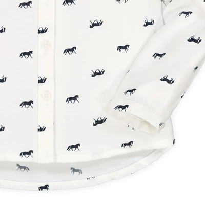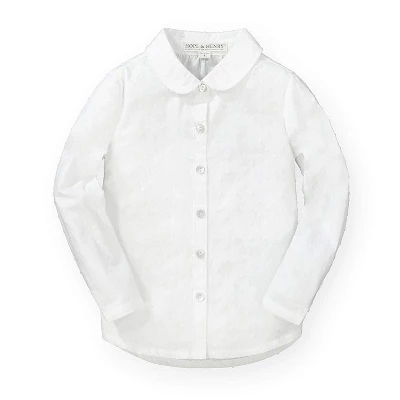 Our sweet button down shirt is crafted in a beautiful swiss dot made from 100% organic cotton for a shirt she’ll be wearing all season long. Features an adorable peter pan collar and real shell buttons at the sleeve cuffs and center front. Top it with one of our pullover sweaters for a complete look!
