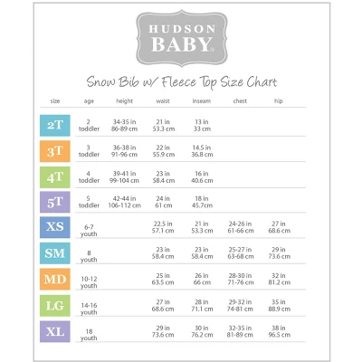 Hudson Baby Youth Fleece Top Bib Overalls keep kids feeling warm and able to enjoy the outdoors longer during the winter season. The multi-fabric construction of these high-performance overalls features a soft, lightweight fleece top to help kids stay warmer while wicking body moisture to keep them dry. The wind and water resistant pants have reinforced knees and hem for durability and strength. Adjustable Velcro straps and an adjustable waist make it easy to create the perfect fit. Boot Cuff with grippers form a seamless integration with the boots to keep the warmth in, and the moisture out. The pants provide zippered pockets, a zippered fly, belt loops and a convenient O ring for keys, gloves, and/or lift tickets. Machine washable, perfect for a quick and easy cleaning after outdoor activities.