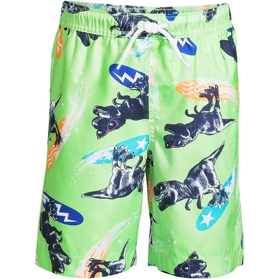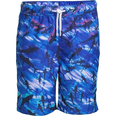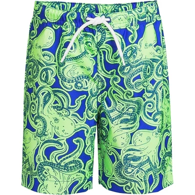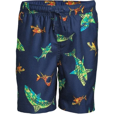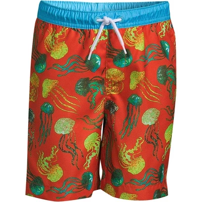 At Lands’ End we’re proud to believe every body is a beach body. And that goes for kids too! Fortunately little boys don’t usually need much to have fun in the sun. Just some sandals a fluffy towel a bucket and shovel…and our great volley swim trunks of course. Made from durable polyester fabric these swim bottoms block harmful UV rays and provide UPF 50 sun protection that doesn’t fade wash away or pollute the ocean. The amazing material is also quick drying (so he won’t get stuck in a soggy suit) and resists damage from chlorine. We’ve also added a faux fly back pocket with drainage grommets and a supportive mesh lining. The elastic waistband has plenty of stretch and the functional drawstring can be tightened or loosened as needed. Take these packable swim trunks along on your next family vacation. He can wear them when he’s splashing in the hotel pool playing in the surf or zipping down a water slide. And since they’re machine washable caring for them couldn’t be easier.