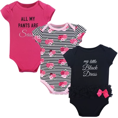 Little Treasure bodysuits are an essential part of baby’s wardrobe. Our bodysuits feature adorable prints, embroideries, stripes and solids and provide a comfortable base layer that’s great for pairing with pants, shorts, or even wearing under outfits. Our bodysuits are comfortable and cozy for all-day, everyday wear for your little one. Little Treasure Baby Girl Cotton Bodysuits 3pk, Little Black Dress is a great baby essentials set for your little one.