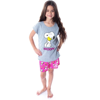 - HIGH-QUALITY PRINTED DESIGNS – This Peanuts pajama set for girls features a short sleeve top and shorts. The shirt features a cute character design of Snoopy holding his best pal, Woodstock, close with Snoopy script. The pajama shorts feature a matching allover character pattern of Snoopy and Woodstock on a cute pink color and elastic-stretch waistband!