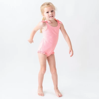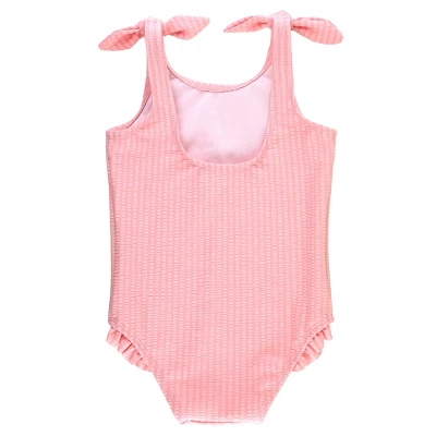 This RuffleButts Pink Seersucker Tie Shoulder One Piece is perfect for your girl’s summer style! Keep her protected from the sun with this UPF 50+ suit and pair with your favorite hat for even more protection from the sun. At the beach or at the pool, she will be ready for all day fun in the sun!