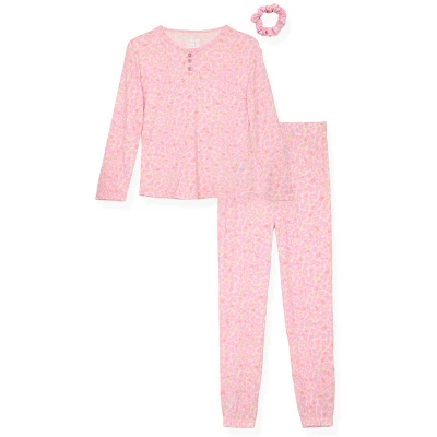 - DESIGN: Introducing our 2-piece Leopard Hacci pajama set for girls, which is the perfect blend of style, comfort, and being snuggle-worthy. The set includes a long-sleeved, dropped shoulder top with a henley neckline and three added button that regulates air circulation throughout the night. The jogger-style long pajama pants for girls have cuffed ankles, an elastic waistline. Furthermore, since this girlÂ’s pajama set is loose-fitting, it is 100% flame resistant, ensuring for your childÂ’s safety.