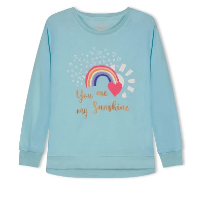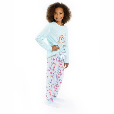 This is the perfect pajama set for your little sunshine. The loose-fitting cut provides perfect dream time comfort. The long-sleeved t-shirt, made from a buttery-soft jersey fabric, has a rainbow and uplifting quote print with glitzy gold glitter detailing. The Minky fabric pants, in an all-over unicorn rainbow print, will be super-cozy against her skin and features an elastic waistband for ultimate comfort and a sweet waist tie detail.