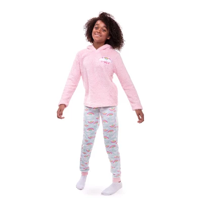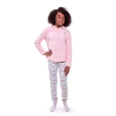 Whether it’s an annoying homework assignment or a list of not-so-fun chores, sometimes you’re just so over it! She’ll feel a lot better once she snuggles into this slouchy furry fleece hoodie with rainbow detail. Matching rainbow print minky fleece pants with a satin bow complete the set.