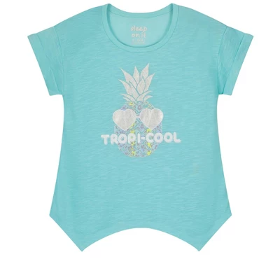 She will be feeling super tropi-cool in this bold 2-piece, super soft and cozy jersey pajama set. The stylish rolled sleeve design and handkerchief style hem makes for a really unique outfit. This pajama set features a popping silver foil pineapple print and contrasting leopard print capri-cut leggings. Perfect for warmer nights.
