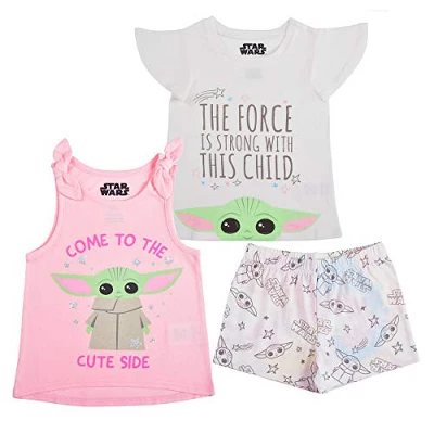 - Star Wars licensed 3-Pack Baby Yoda Matching Set features the cutest character from The Mandalorian show and if you feel that the force is strong with your child, this one is for her! Inclusive of 1 Come To The Cute Side Sleeveless Shirt with Shoulder Bows, 1 The Force Is Strong With This Child Short Sleeve T-Shirt, and 1 Play Shorts all featuring The Child. Made with super soft and breathable materials to guarantee cool and comfy skin all day. These pieces also offer enough stretch so she can play and move without limit. Jump to the light side in style with Baby Yoda!