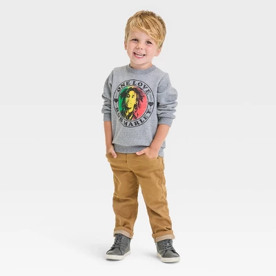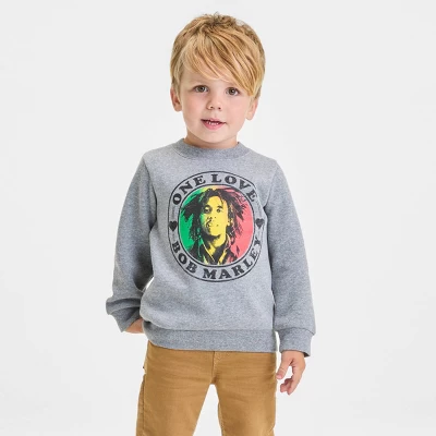 Add some music-inspired vibes to your toddler’s cool-weather wardrobe with this Bob Marley Printed Pullover Sweatshirt. The long-sleeve sweatshirt is adorned with colorful artwork of Bob Marley in a circular typographic frame that reads ” One Love” and “Bob Marley” for a fun, fan-favorite look. Plus, it’s styled with ribbed trim on the crewneck, wrists and below-waist hem for neat styling. Made of a midweight cotton blend, the graphic sweatshirt helps keep your child comfy and cozy, while the pullover style with shoulder snaps allows for easy wear.