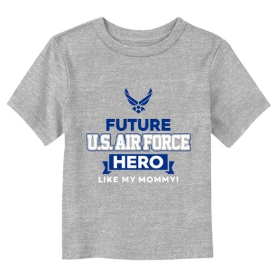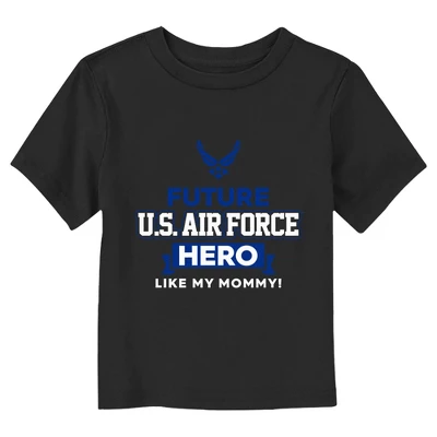 - The smallest family members are also the most stylish with this new toddlers’ t-shirt that is perfect for every occasion! Featuring the phrase: “Future U.S. Air Force Hero like my mommy!” in blue and white lettering across the front.